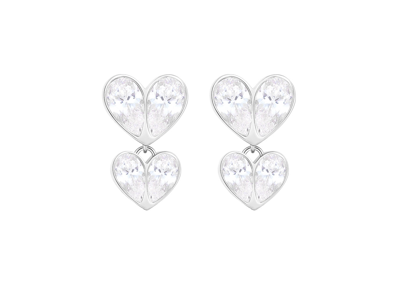 Two teardrop-shaped stones unite to create a heart shape, with a smaller heart hanging below. The design allows the earrings to move gracefully with the wearer, capturing light and attention with each movement.