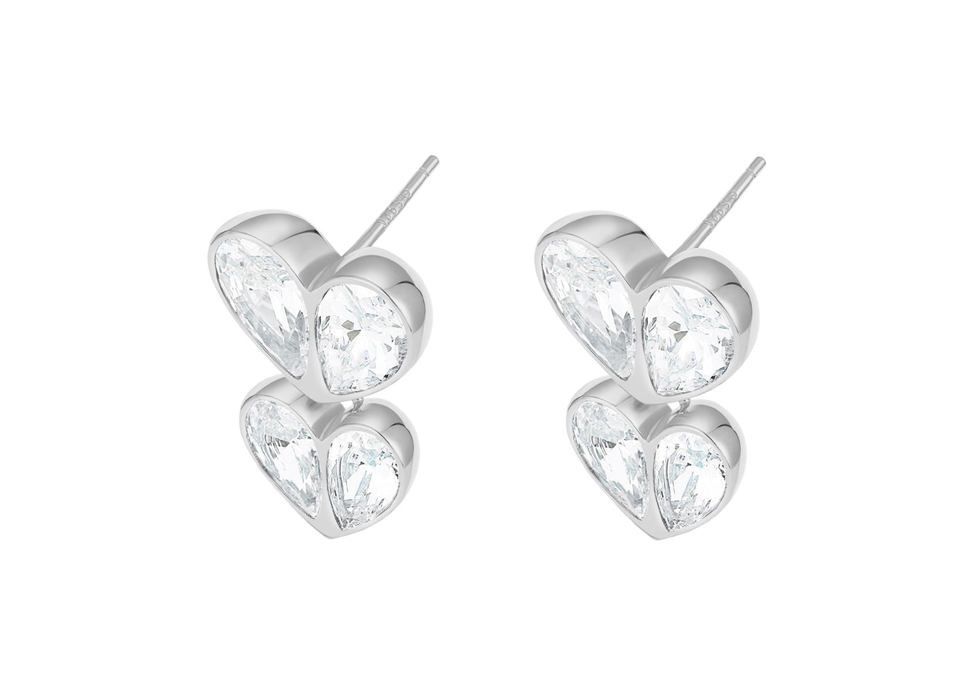The high-brilliance cubic zirconia stones are hand-set in a bezel setting by skilled artisans. This technique enhances the smooth, rounded appearance of the hearts, ensuring a seamless and polished look.