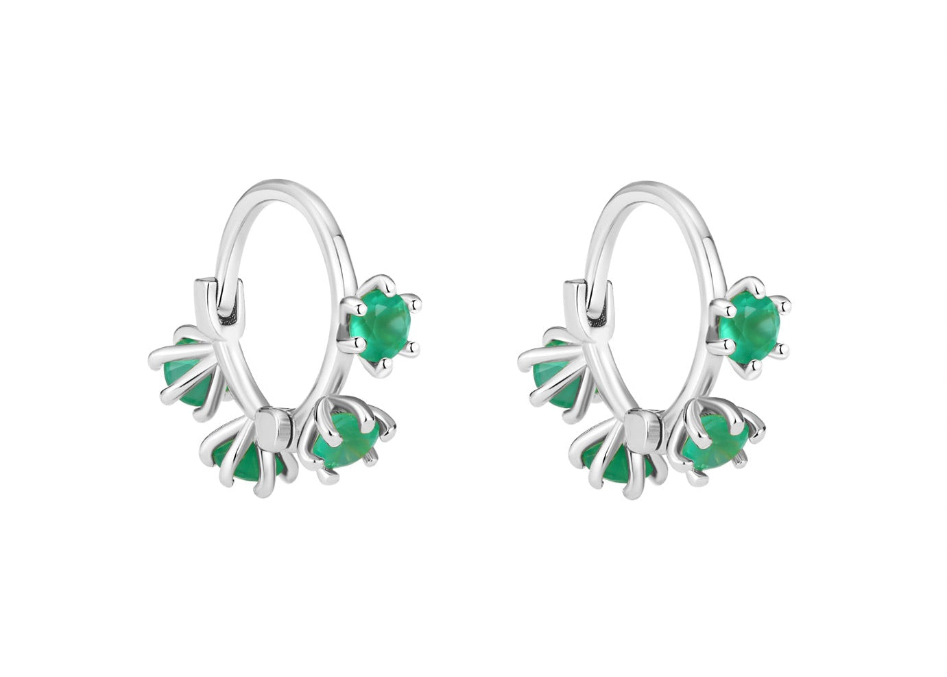 Featuring natural green agate, these hoops boast a deep, rich hue with a lustrous finish, meticulously hand-set. The six-prong setting enhances the gemstone's brilliance, while the petite size ensures exquisite detail and craftsmanship.