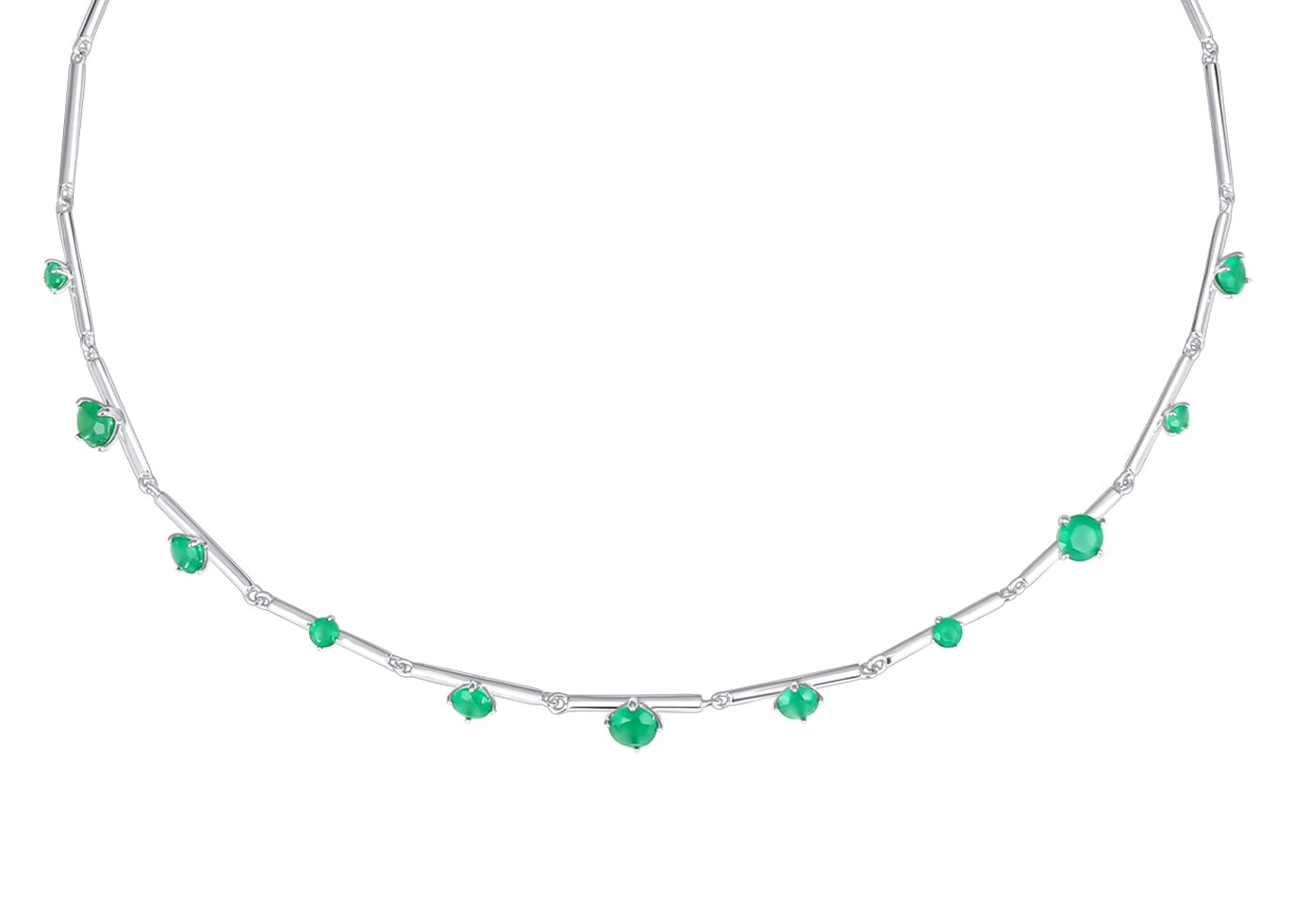 The bamboo-link chain is carefully crafted to mimic bamboo's natural form. Eleven prong-set gemstones are uniquely angled, creating a dynamic visual effect. The stones spiral around the chain, resembling twinkling stars in the night sky—a refined tribute to celestial elegance.