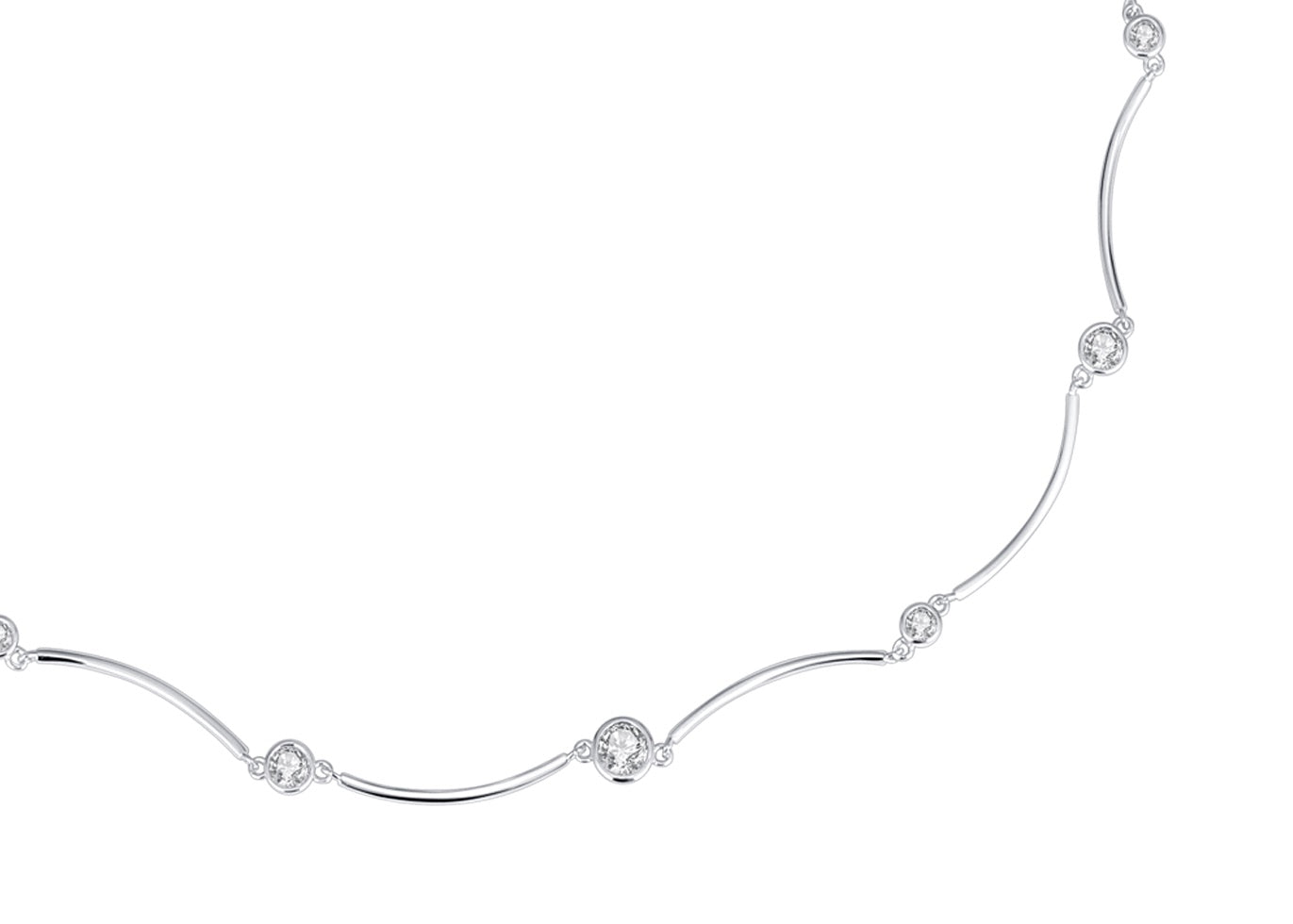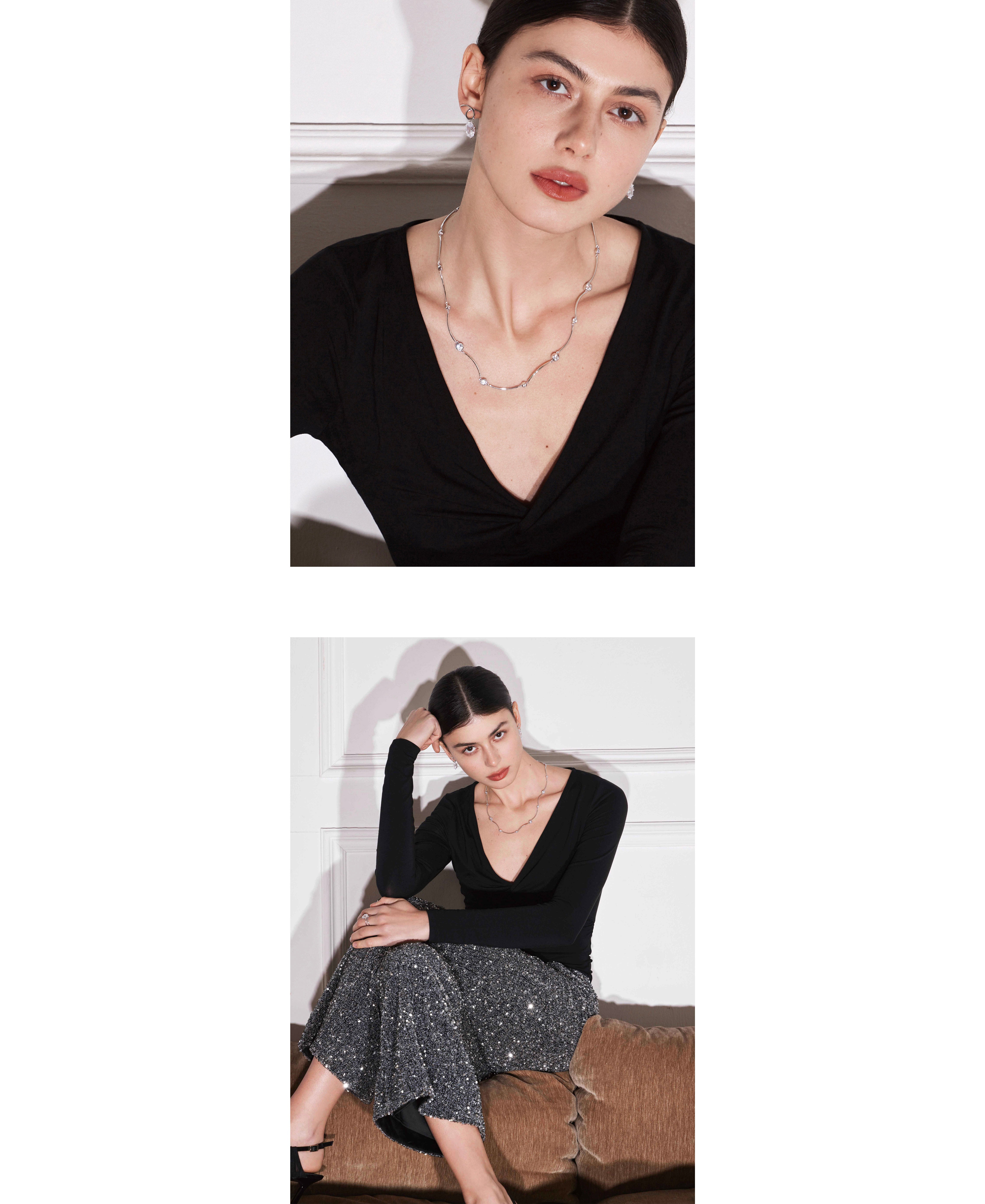This necklace is composed of multiple curved segments, seamlessly connected by bezel-set high-brilliance cubic zirconia. The design is inspired by the light and movement of champagne bubbles, with each stone placed to evoke the lively and sparkling nature of this celebratory drink.