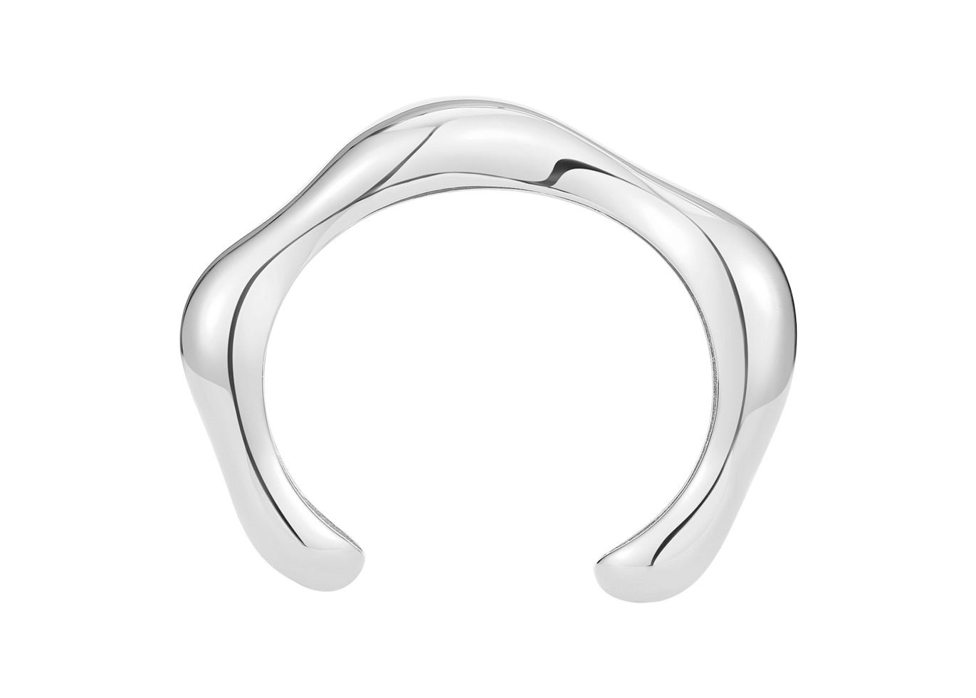 The cuff bracelet’s design is an artistic representation of liquid flow, with undulating, asymmetrical curves that create a dynamic, organic silhouette.