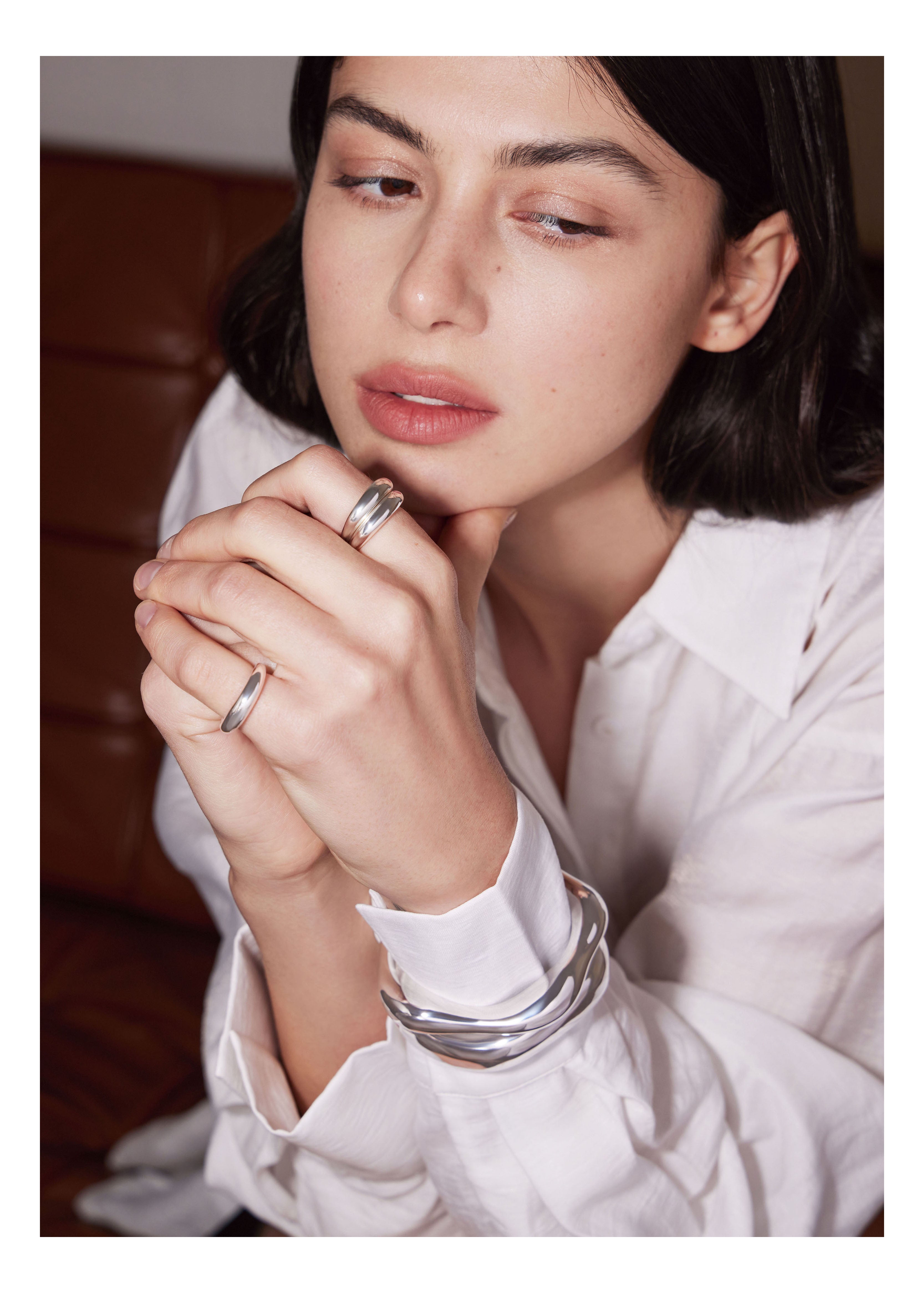 Wear the cuff on its own for a bold statement or combine it with rings from the Gentle Metal Collection to amplify the modern, sculptural aesthetic. The interplay of these pieces creates a cohesive yet eye-catching ensemble that celebrates contemporary elegance.