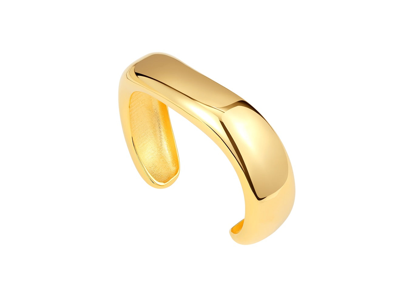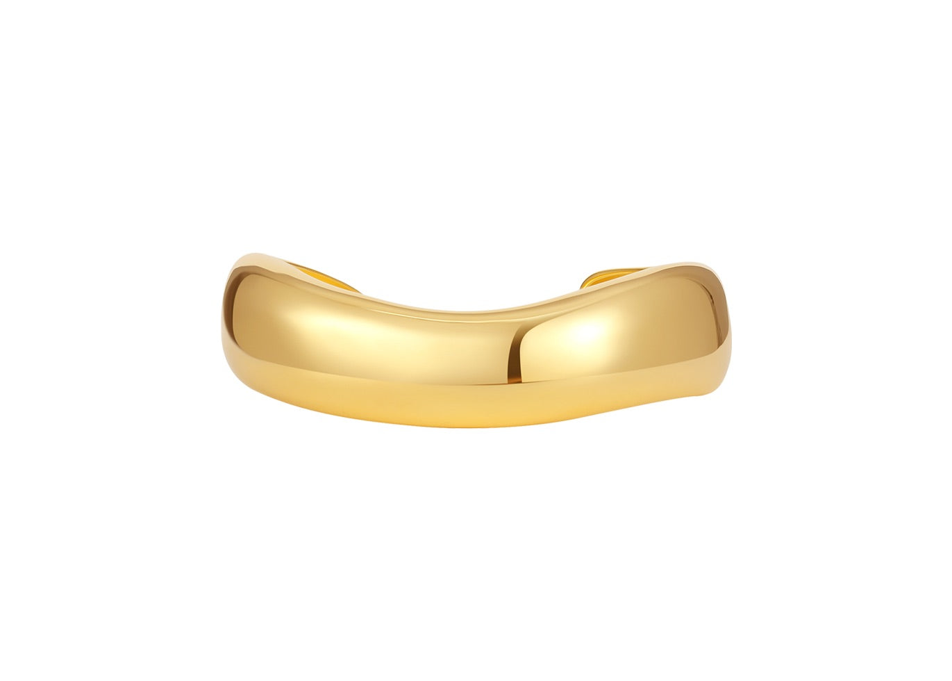The cuff features a broad, asymmetrical design that flows like a modern sculpture, blending boldness with delicate curves to create a striking silhouette.