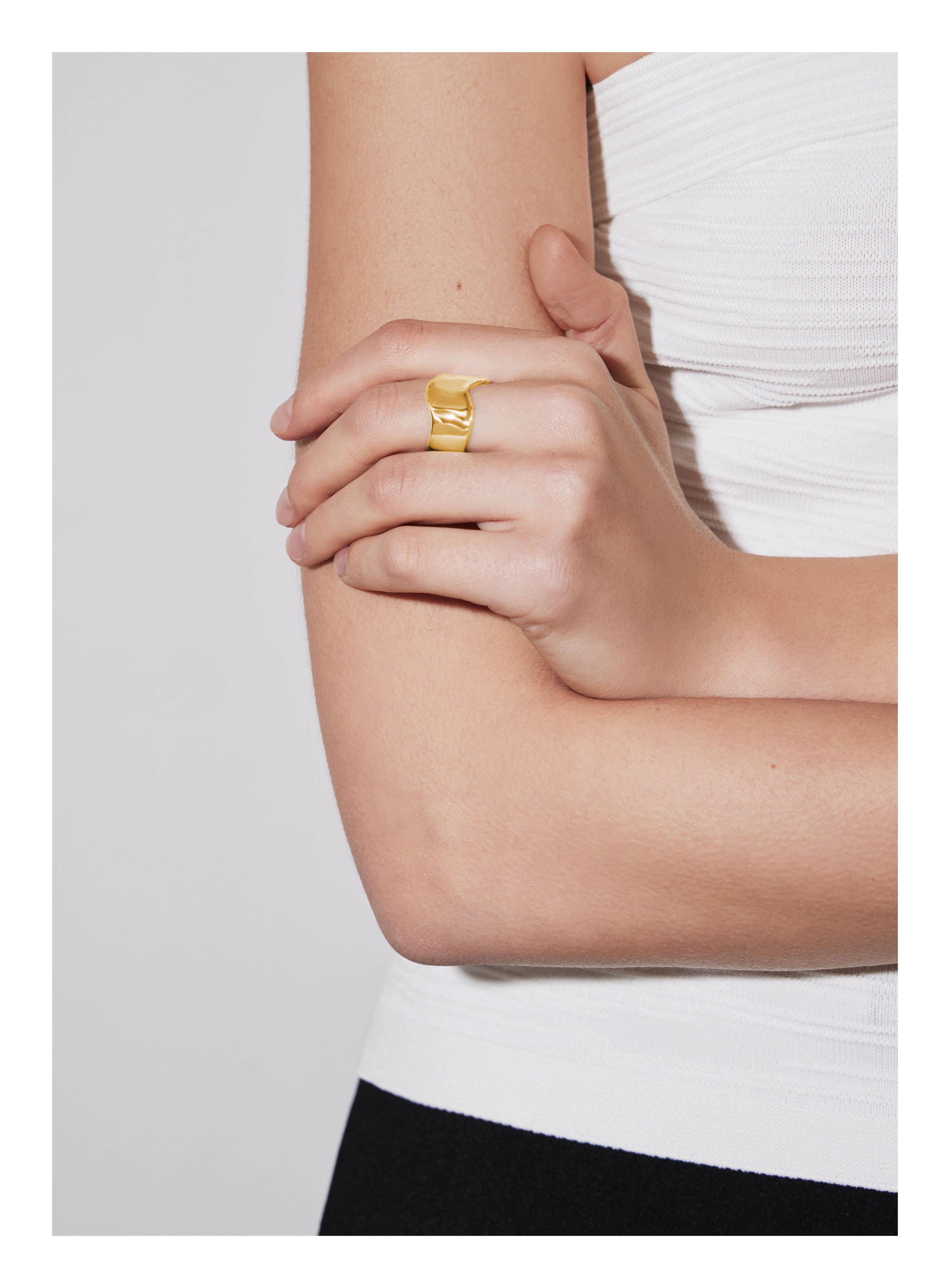 The ring's silhouette mirrors the delicate ripples on water, with subtle undulations on the band surface, reflecting light in a captivating, understated manner.