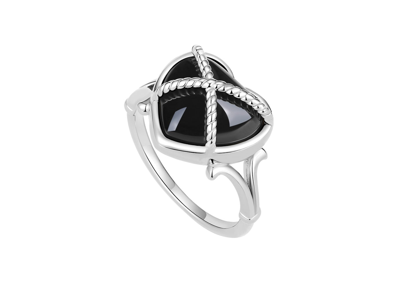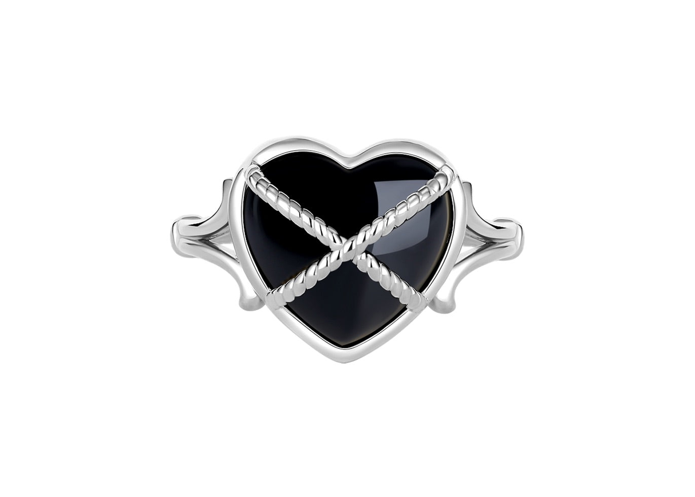 Two sculpted cords delicately cross over a glossy black heart, forming a bold yet tender embrace. The intricate band details echo a vintage romanticism, adding depth to the statement design.